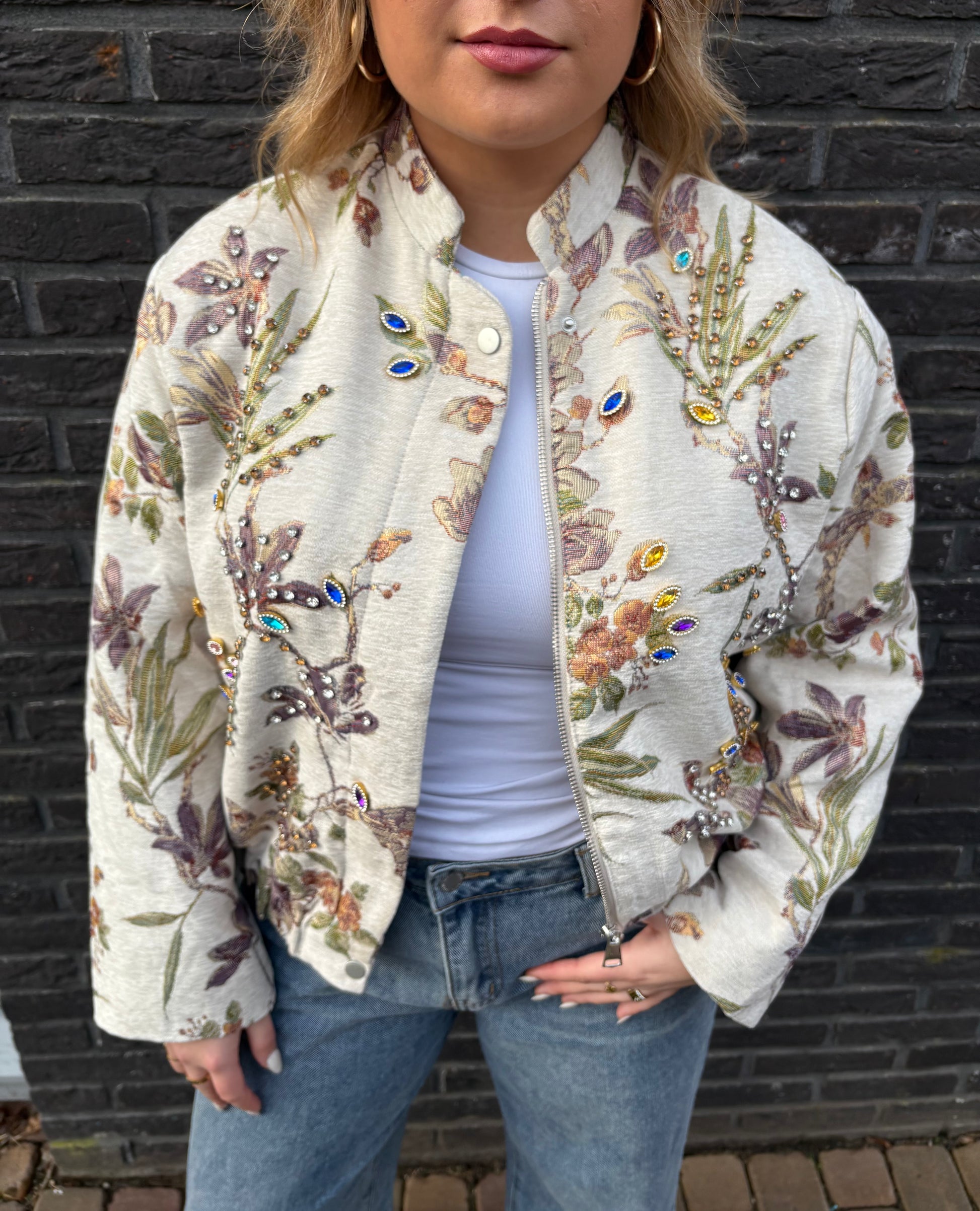 Wauww! Dit jasje is rijkelijk afgewerkt met geborduurde bloemen en luxe jewel details die stevig vast zijn genaaid voor een hoogwaardige afwerking. De bomber fit valt ruim geeft een stoere touch, terwijl de zachte stof en verfijnde details zorgen voor een vrouwlijke uitstraling. Perfect om elke outfit net dat extra te geven! 🤩